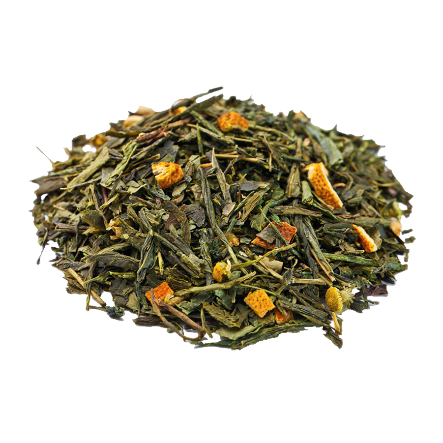 Зелёный чай сенча с добавлением цветков липы, соцветий ромашки и цедры апельсина.